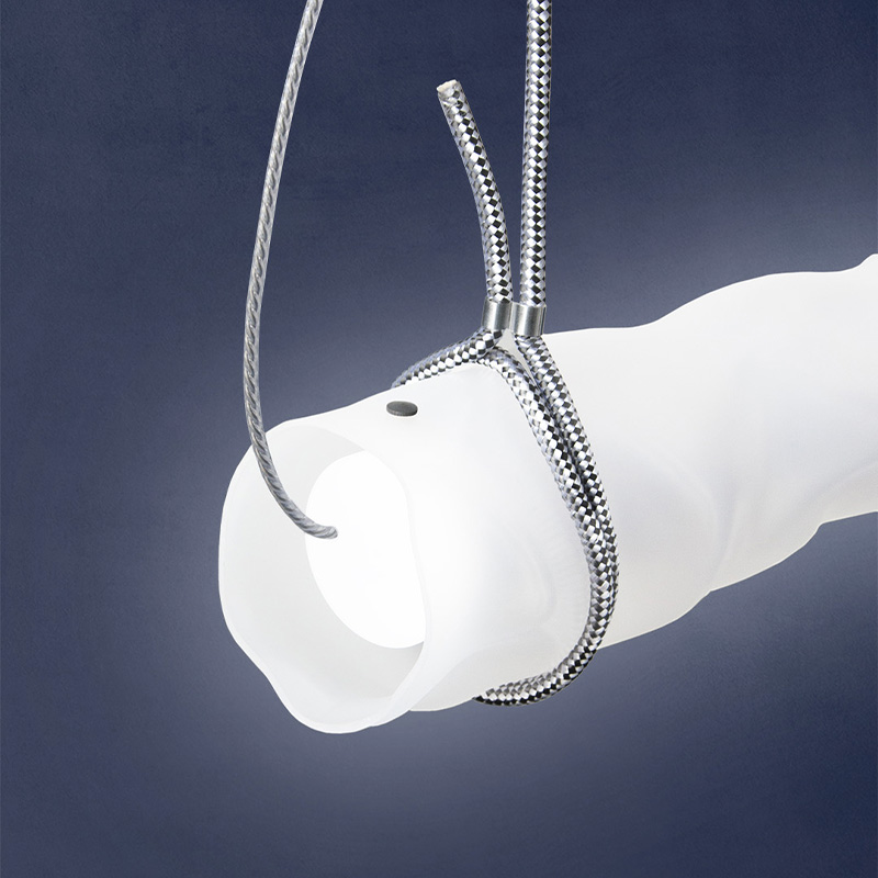 Inspired by oversized pants, Baggy stands out for its innovative design, featuring a satin-finished polycarbonate diffuser that mimics the irregular look of a crumpled paper tube. The two-tone textile rope, a tactile and unexpected element, challenges tradition, creating a playful balance between imperfection and irony.