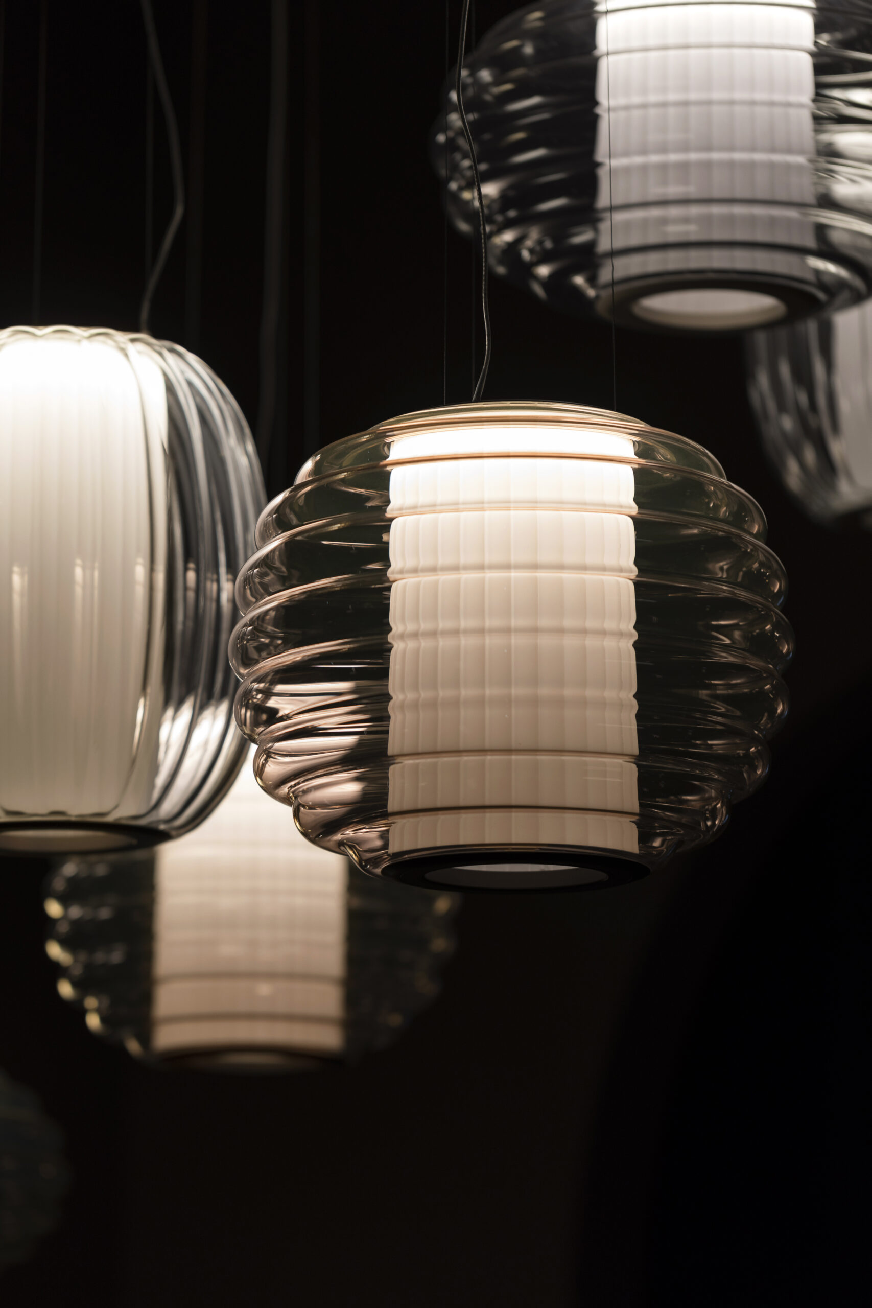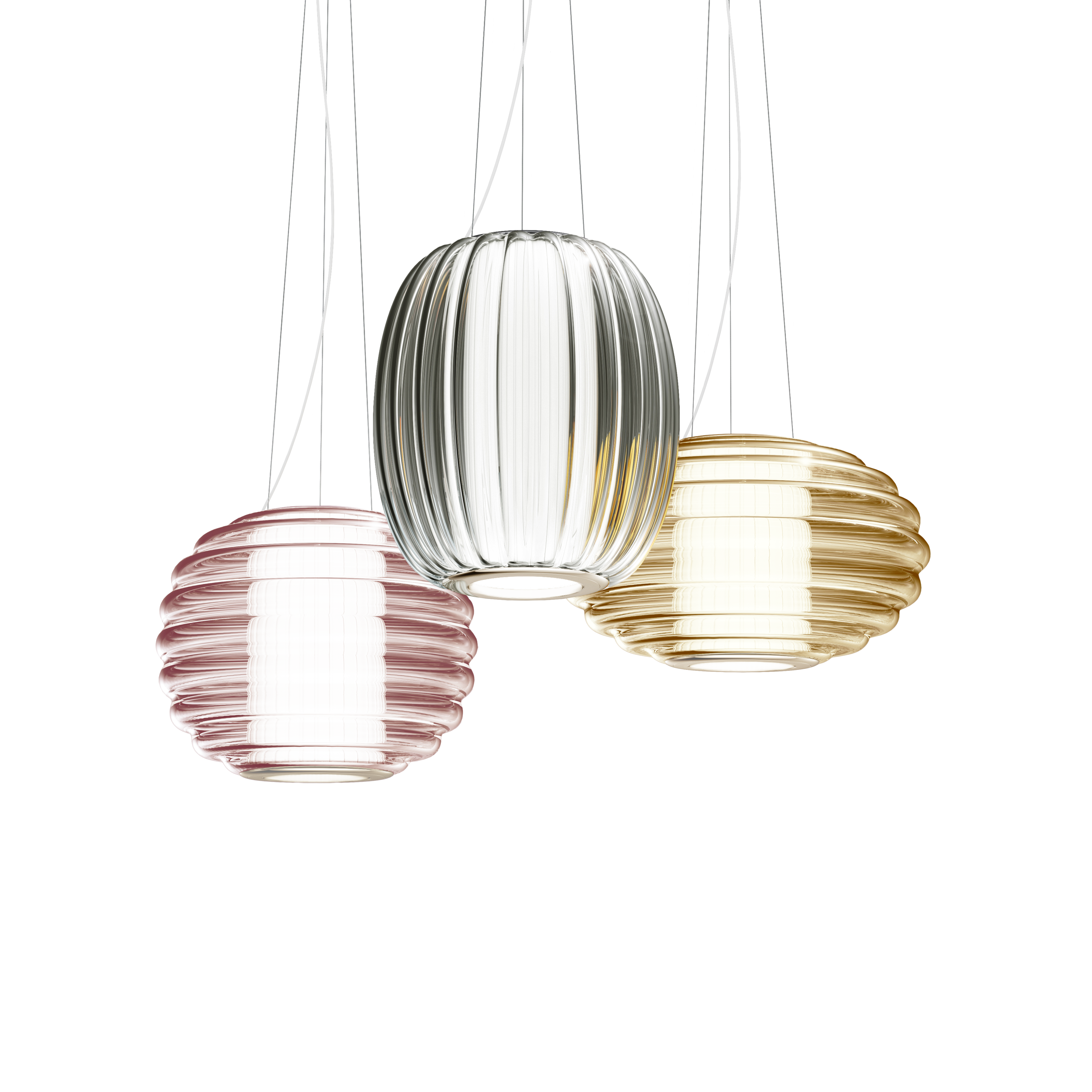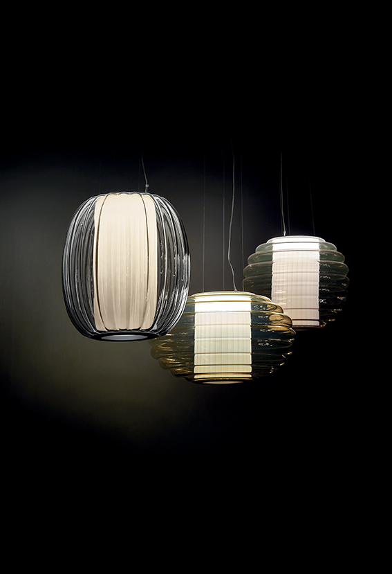 Blown glass and pleated fabric diffusers blend together in pendant, table and floor lamps.