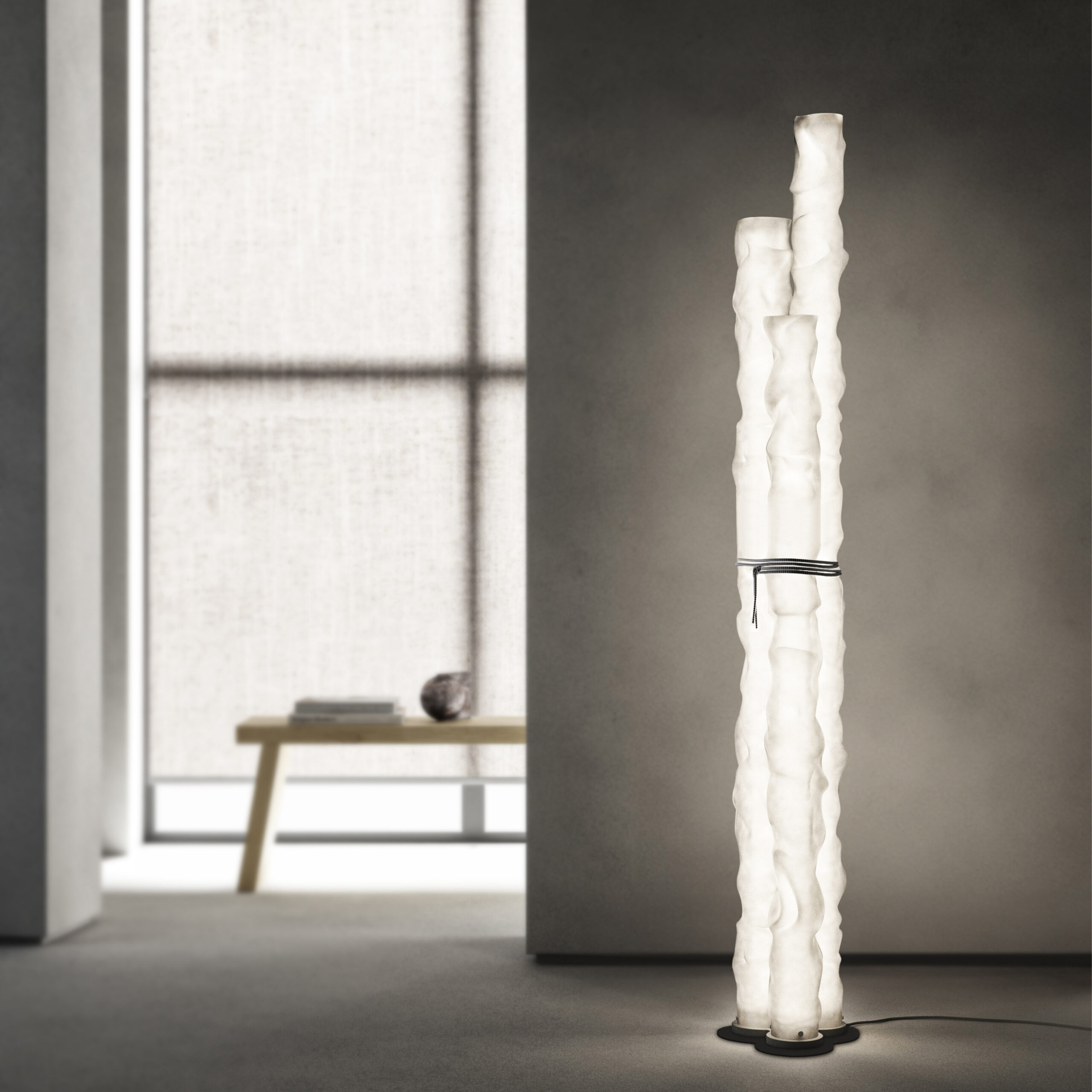 The Baggy Trio floor lamp is composed of three elements in double-satin polycarbonate diffusers of different heights – 150, 160 and 180 cm – with the irregular appearance of a crumpled paper tubes, while the base is in grey finish. The distinctive soft textile cord in white/grey – a detail that expresses the brand’s archi-decorative stylistic code – becomes a joining element for the table and floor variants adn supports the lamp in the suspended version.
