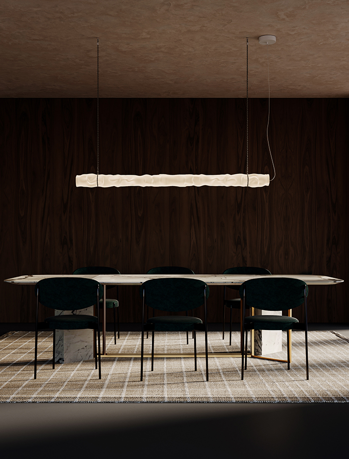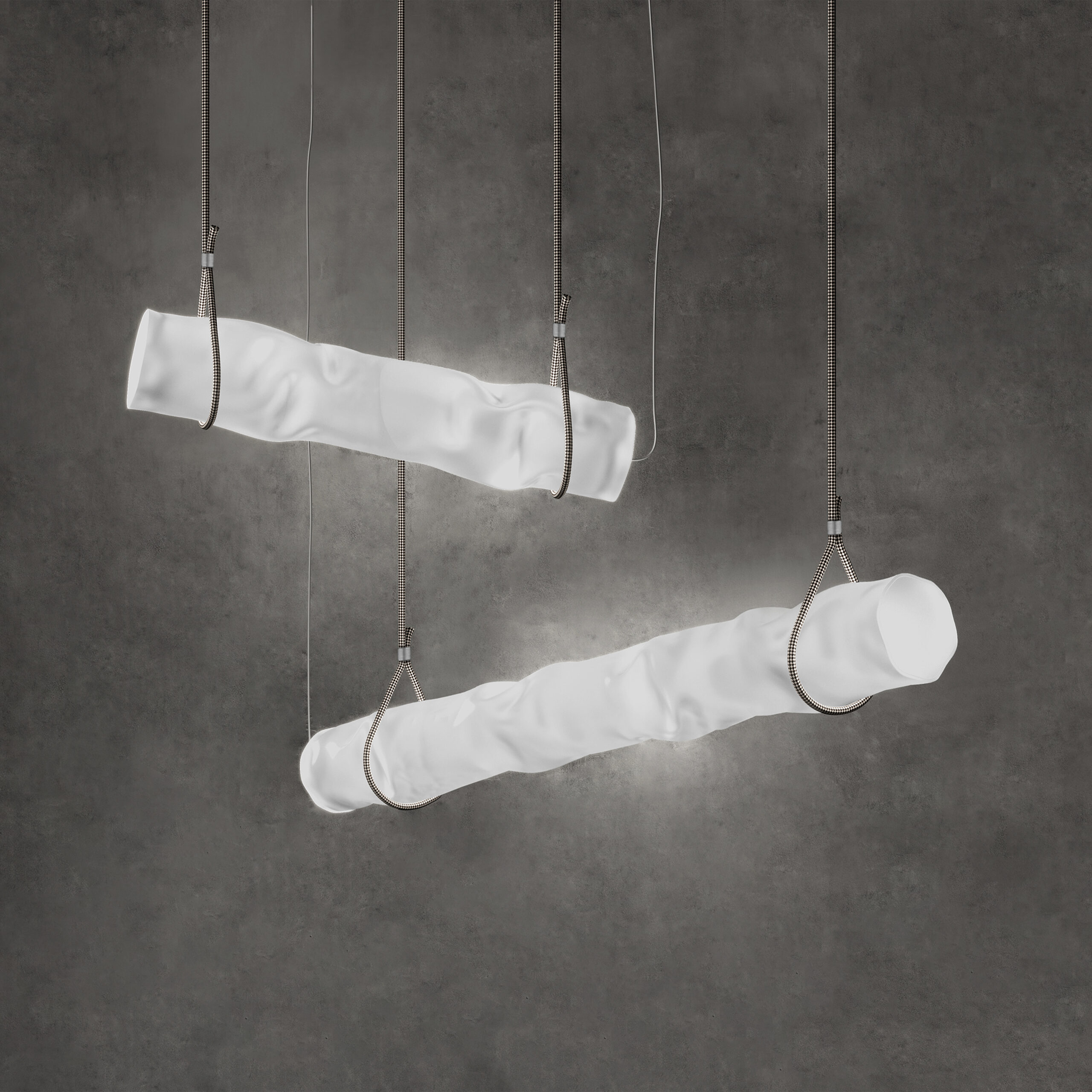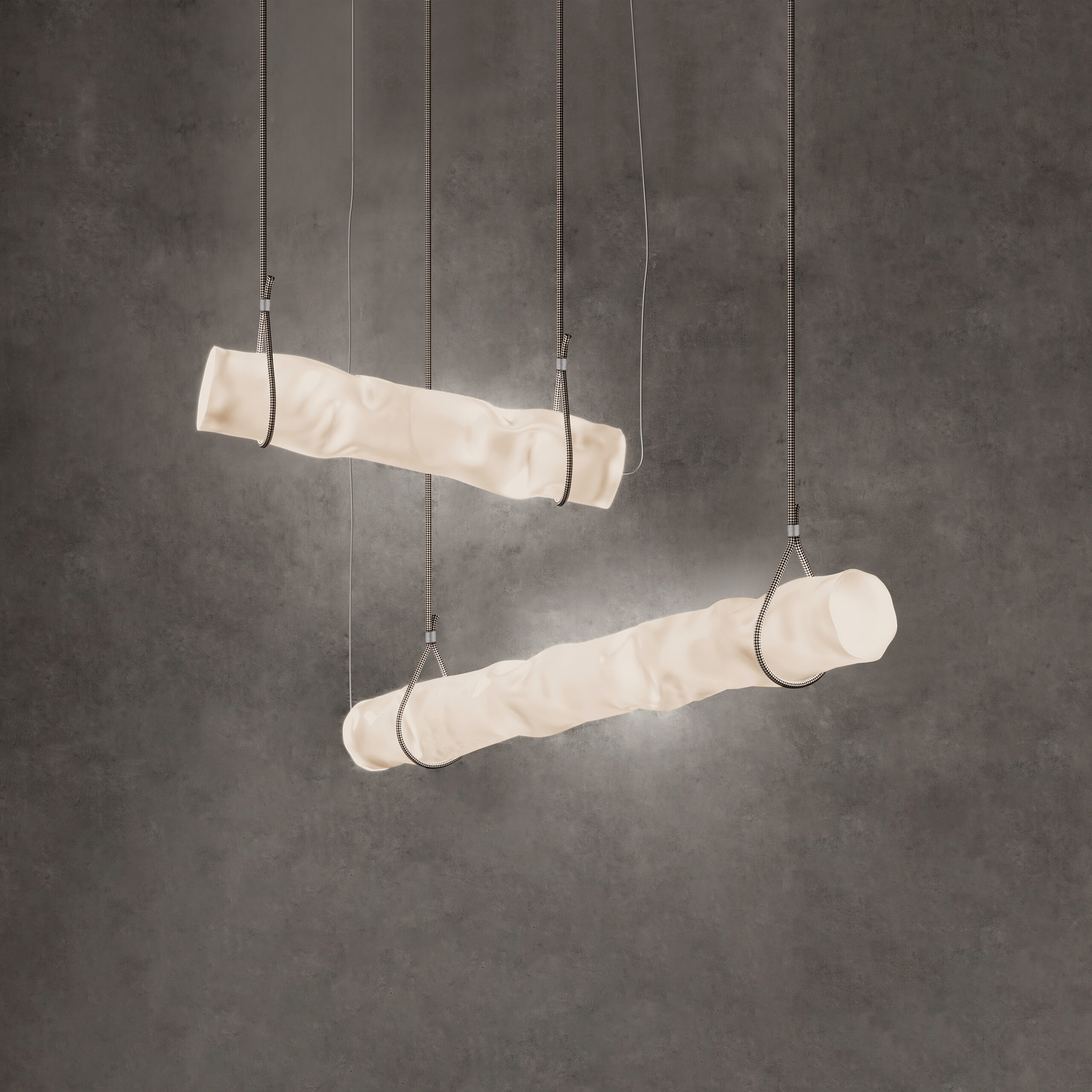 The Baggy horizontal suspension lamp has a double-satin polycarbonate diffuser with the irregular appearance of a crumpled paper tube, while the ceiling rose is in matt white lacquered finish. The distinctive soft textile cord in white/grey – a detail that expresses the brand’s archi-decorative stylistic code – supports the lamp in the suspended version and becomes a joining element for the table and floor variants. The horizontal suspension version of the product is available in three lenghts: 60, 90 and 180 cm. Baggy is also offered in the vertical suspension, table, and floor lamp versions.