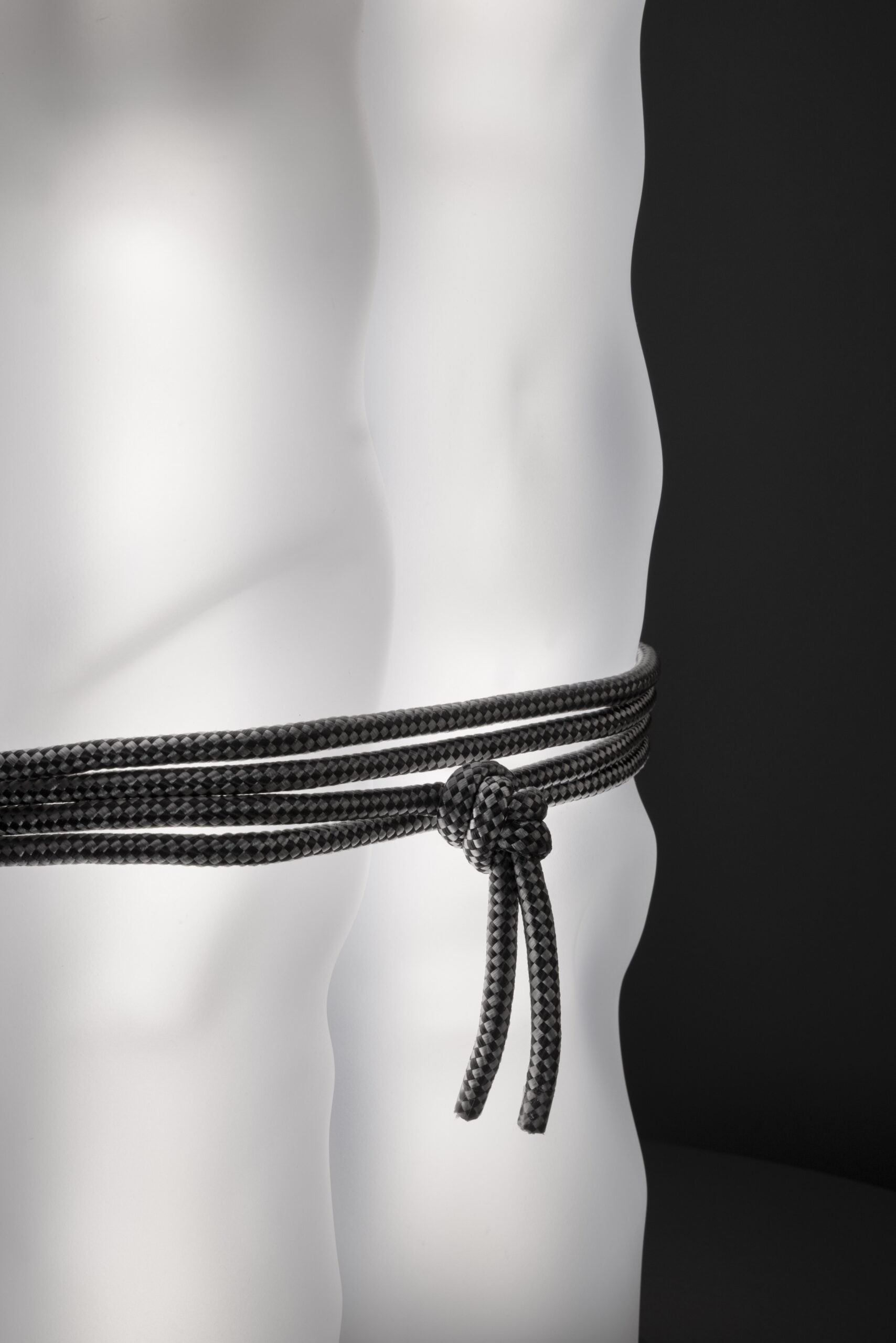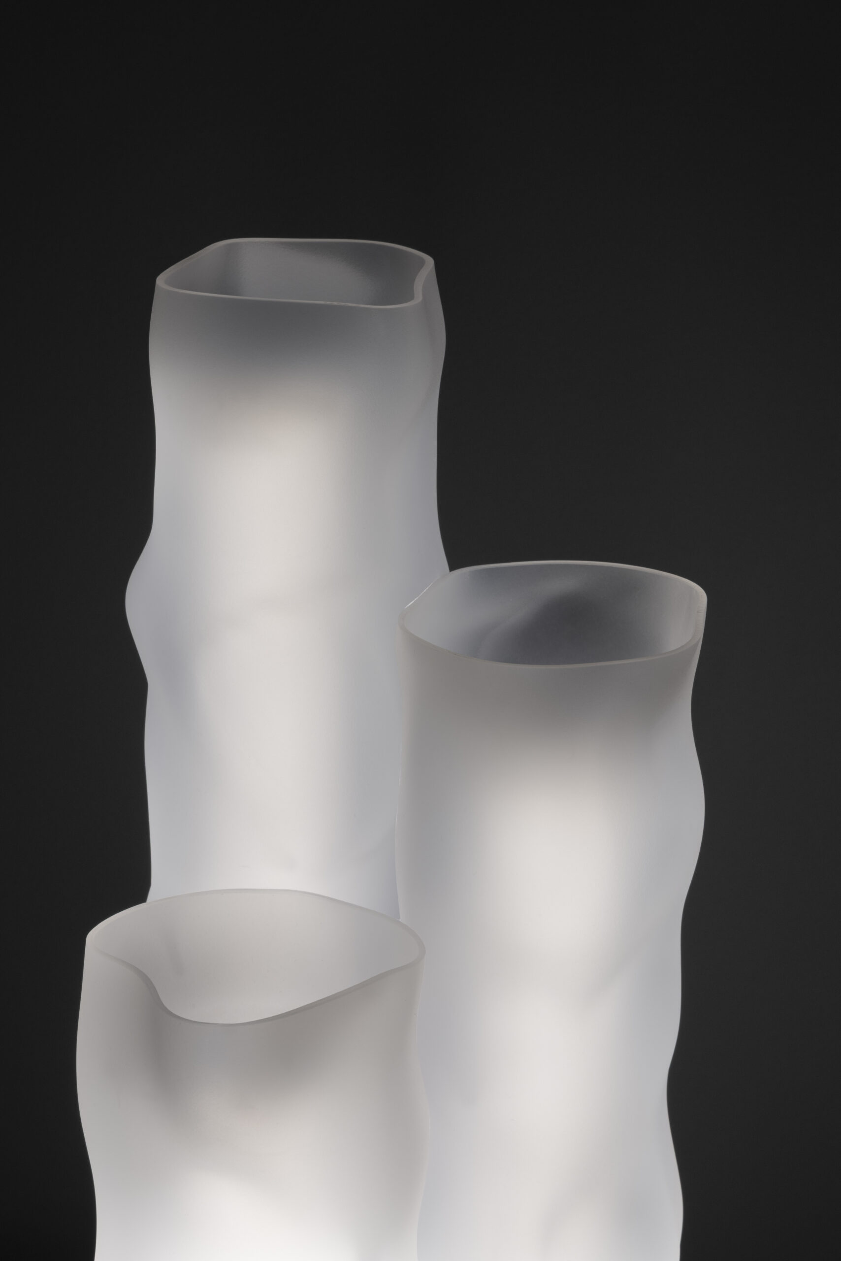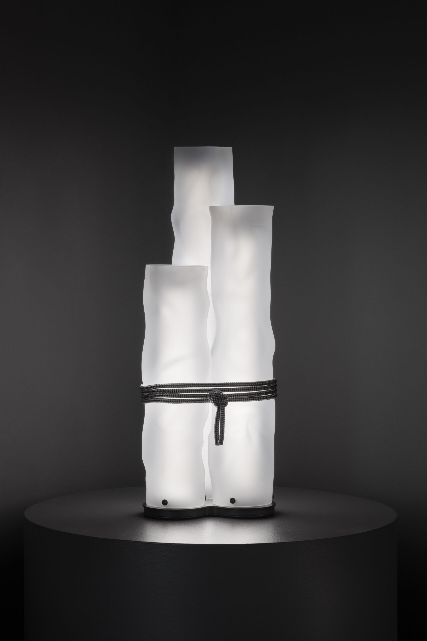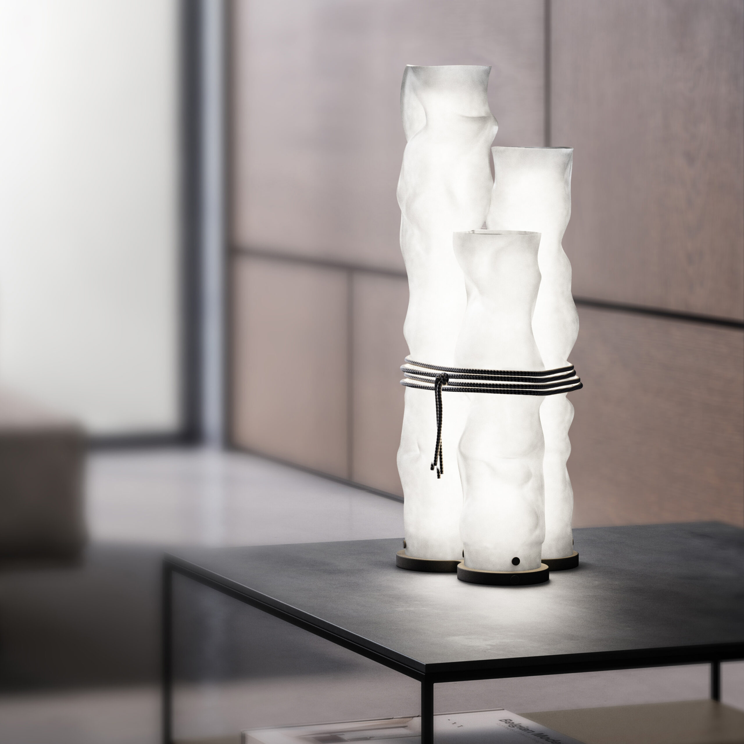 The Baggy Trio table lamp is composed of three elements in double-satin polycarbonate diffusers of different heights – 30, 50 and 60 cm – which have the irregular appearance of crumpled paper tubes, while the base is in grey finish. The distinctive soft textile cord in white/grey – a detail that expresses the brand’s archi-decorative stylistic code – becomes a joining element for the table and floor variants and supports the lamp in the suspended version.