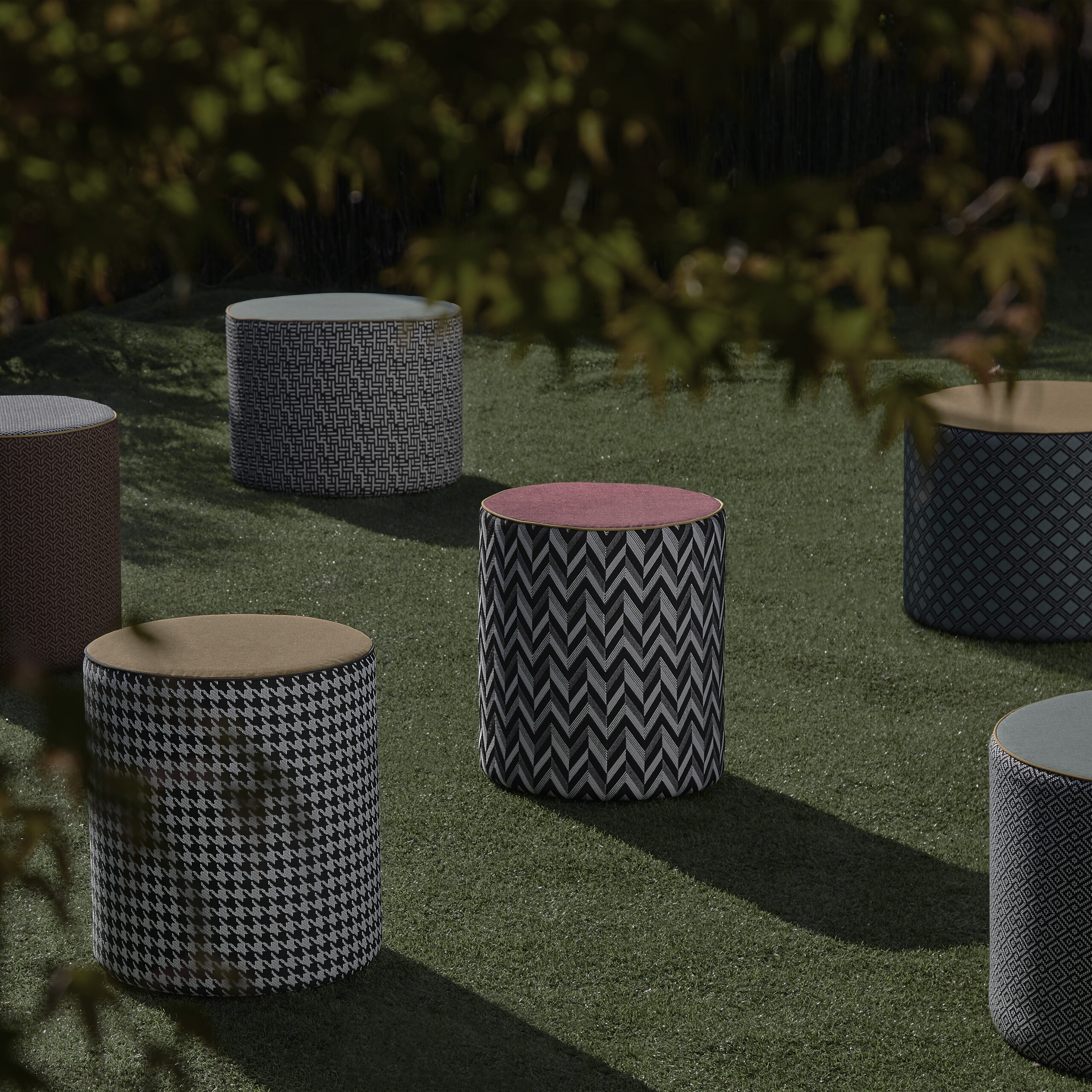 The exclusive textures of Calypso and Babu fabrics become the unique covers of CALYBABU: the outdoor ottoman collection, conceived by Contardi, is presented with five combinations of geometric motifs in different colours. Waterproof fabrics, water repellent polyurethane padding and structure are suitable for outdoor use. The product is supplied with an additional waterproof protective cover.