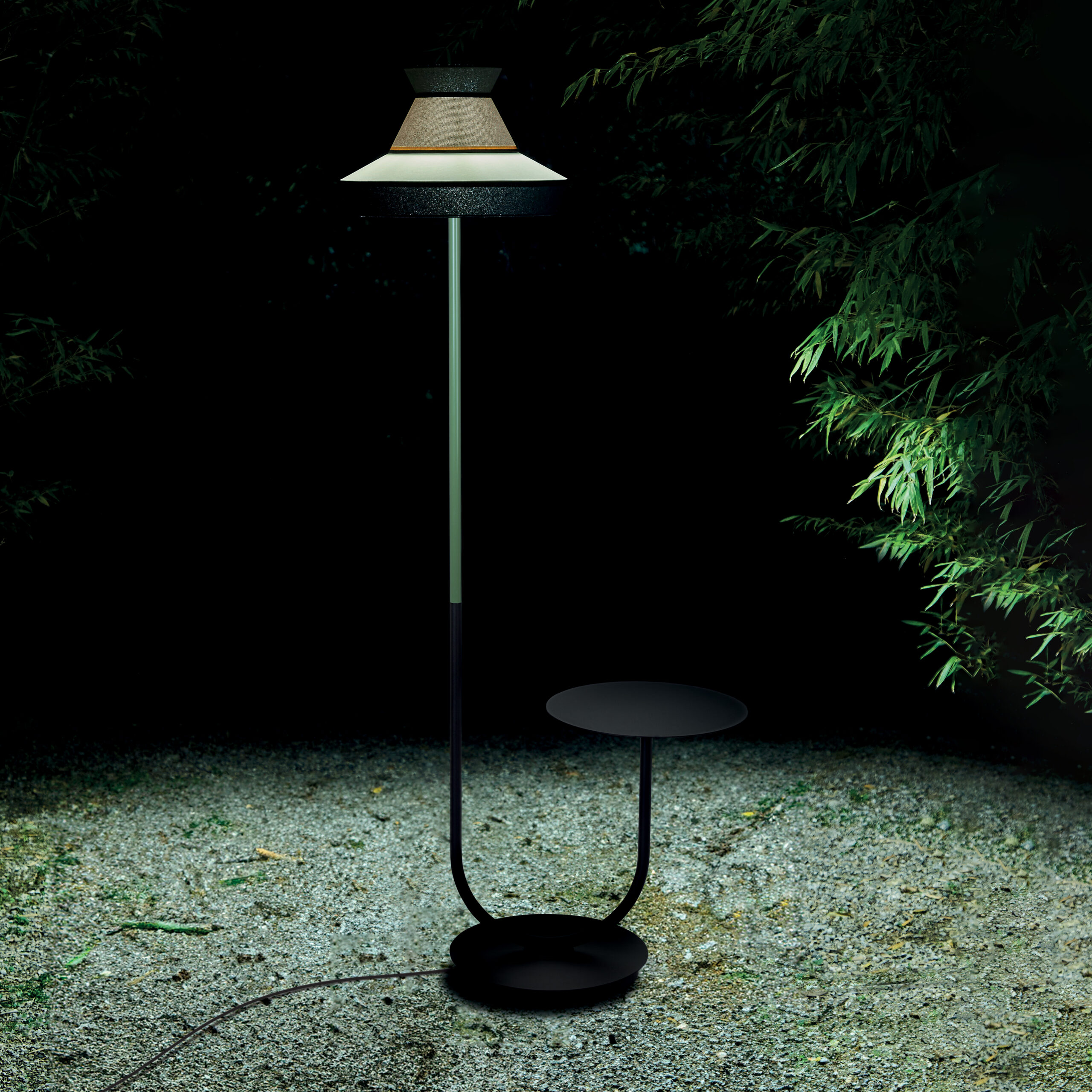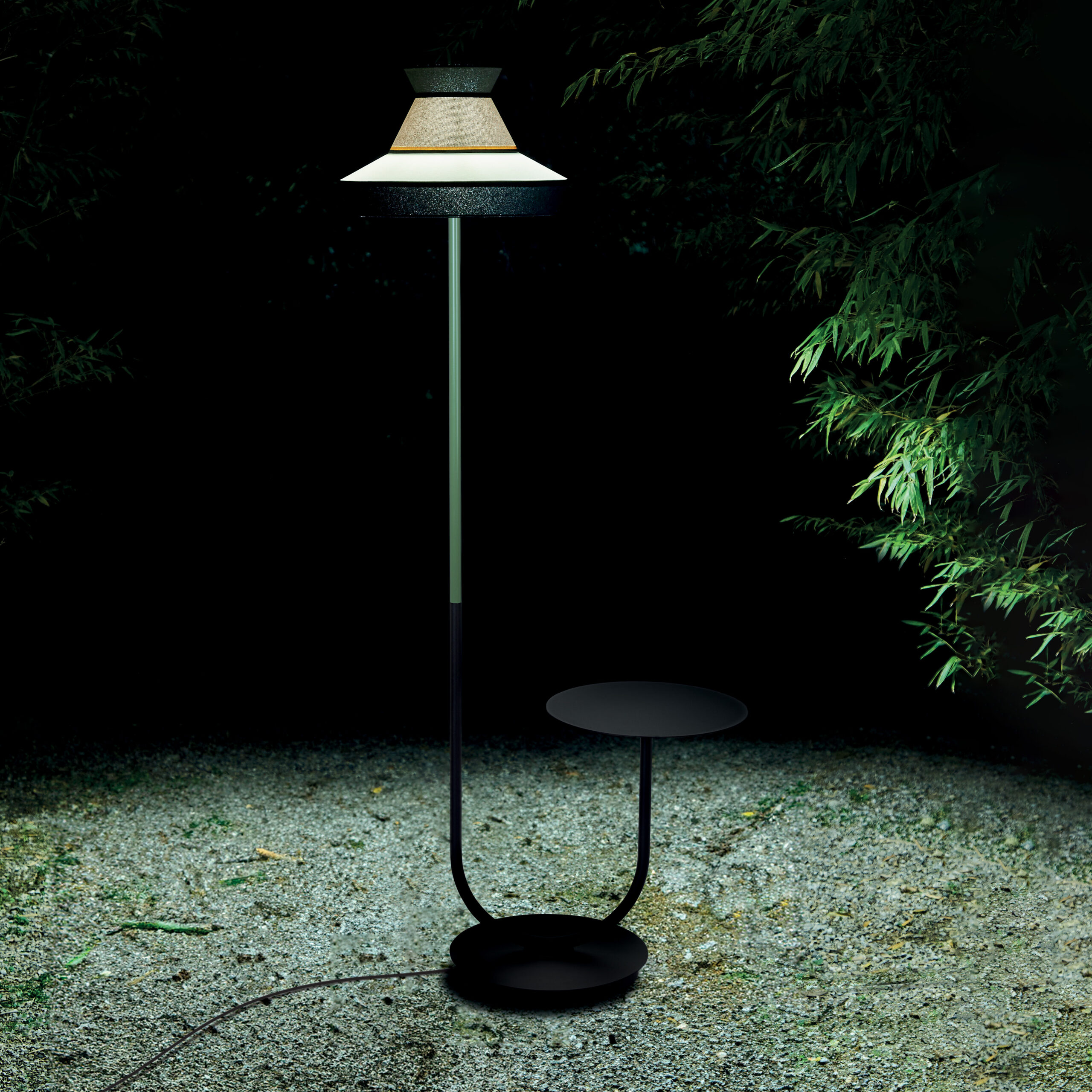 The Calypso range grows with the floor-standing version, again as an IP65 outdoor lamp. This product is available in two versions: single floor lamp with a shade, double structure with a shade and a table. The light source is placed inside a glass cylinder that is sealed to guarantee the IP65 degree of protection. The lower part of the structure is black lacquered, as is the coffee table. The upper part is RAL 6011 green lacquered. The lamps are supplied with an IP68 connector.