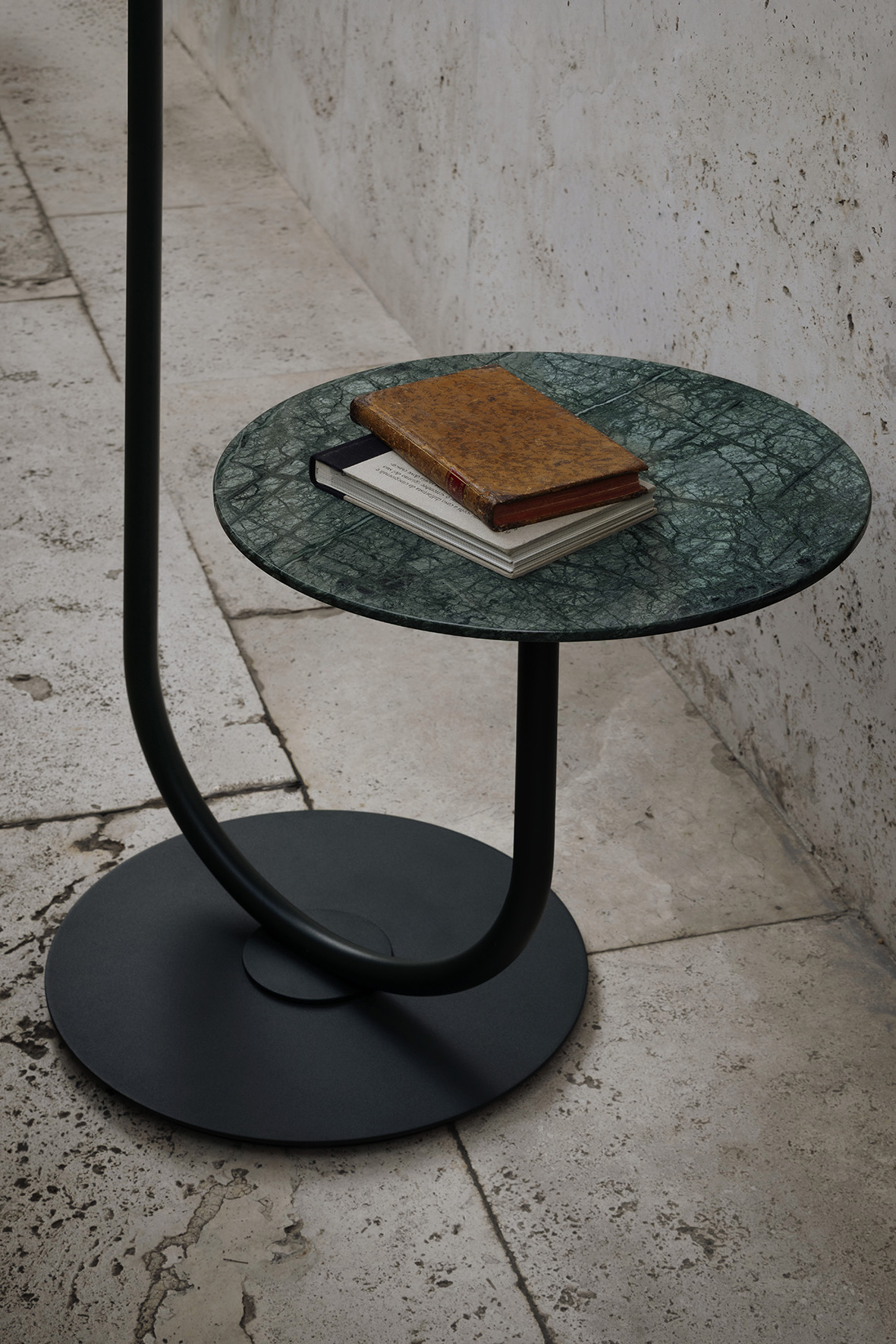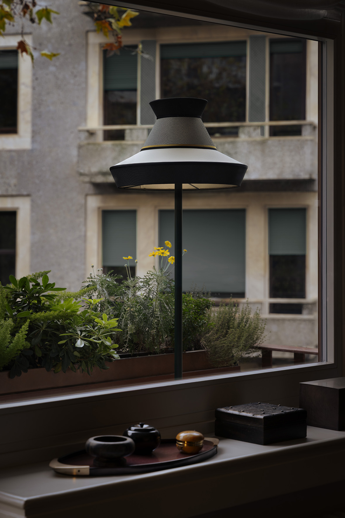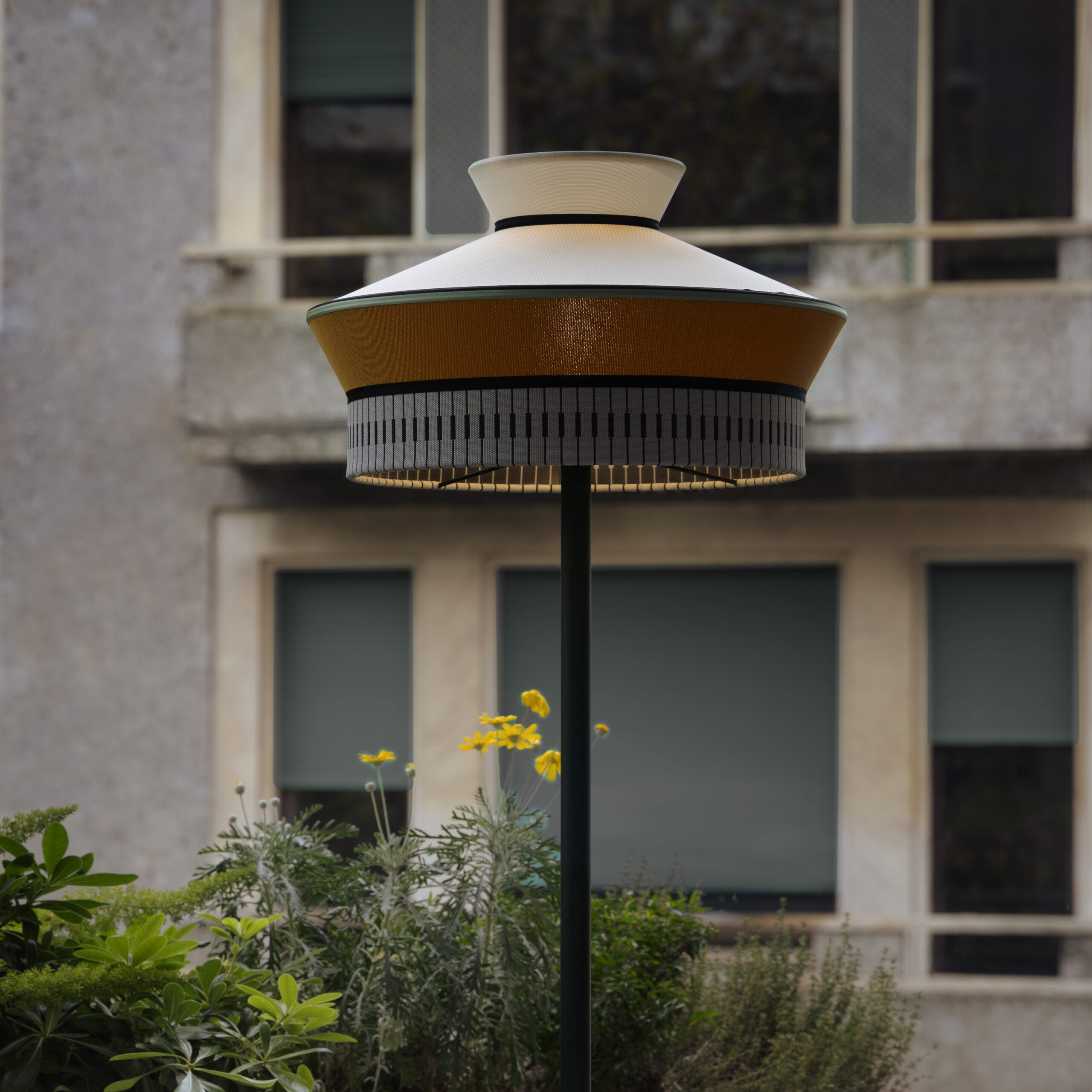 The Calypso range grows with the floor-standing version, again as an IP65 outdoor lamp. This product is available in two versions: single floor lamp with a shade, double structure with a shade and a table. The light source is placed inside a glass cylinder that is sealed to guarantee the IP65 degree of protection. The lower part of the structure is black lacquered, as is the coffee table. The upper part is RAL 6011 green lacquered. The lamps are supplied with an IP68 connector.