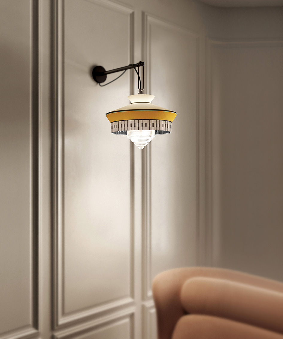 The wall version is distinguished by a slim and elegant arm in a dark brown finish, complemented by a brushed bronze ring that supports the lamp.