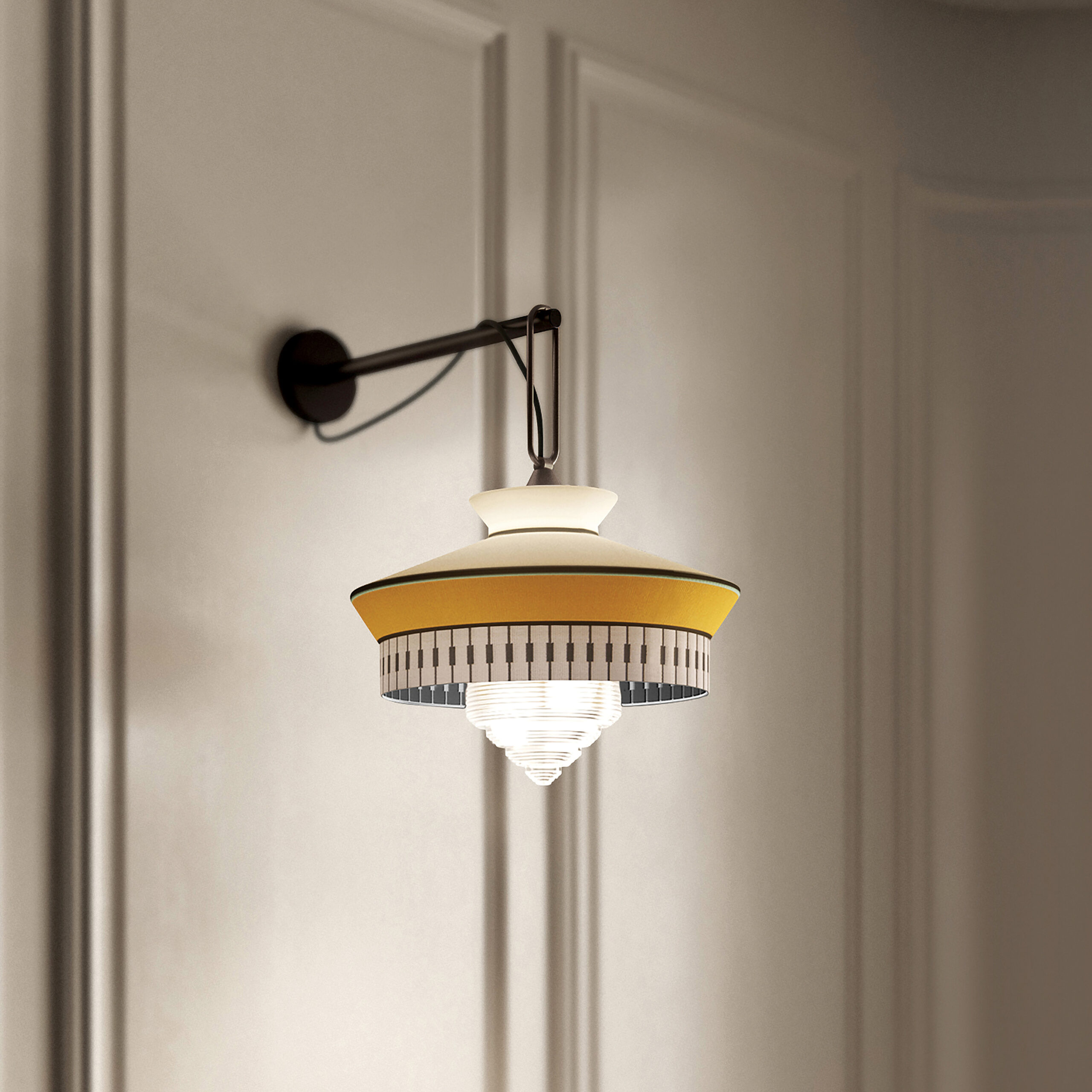 The wall lamp version is characterised by a thin and elegant arm with a matt silk black lacquered finish. It also has a satin brass ring that supports the lamp.