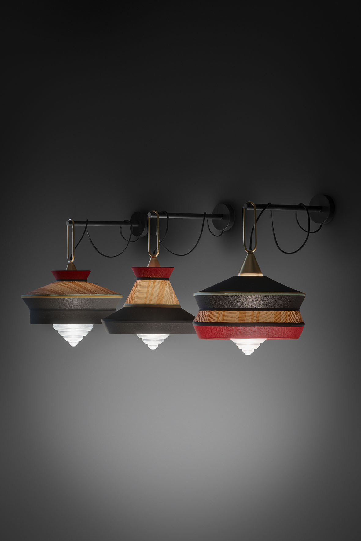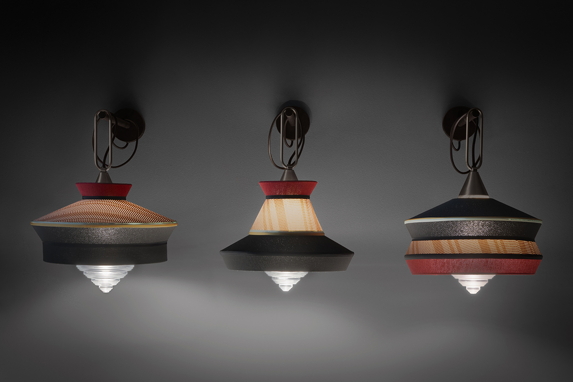 The fabric lampshade, capable of playing with different materials, in the Antigua, Guadalupe and Martinique models is composed of different shapes, decorations and colours to complete spaces in the name of creative freedom.