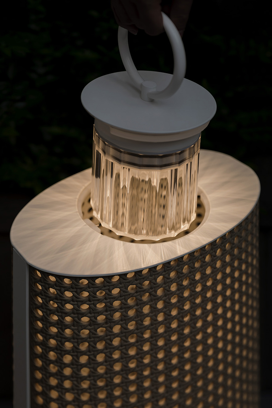 With its warm and evocative glow, Clara is a lantern with immense emotional appeal, enhanced by the innovative technology employed. The diffuser is crafted from waterproof, UV-treated resin with a Vienna straw effect.