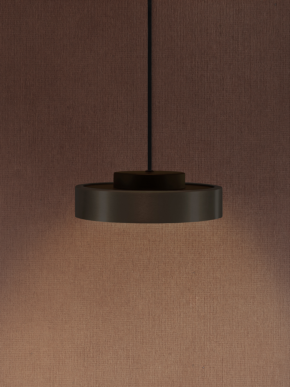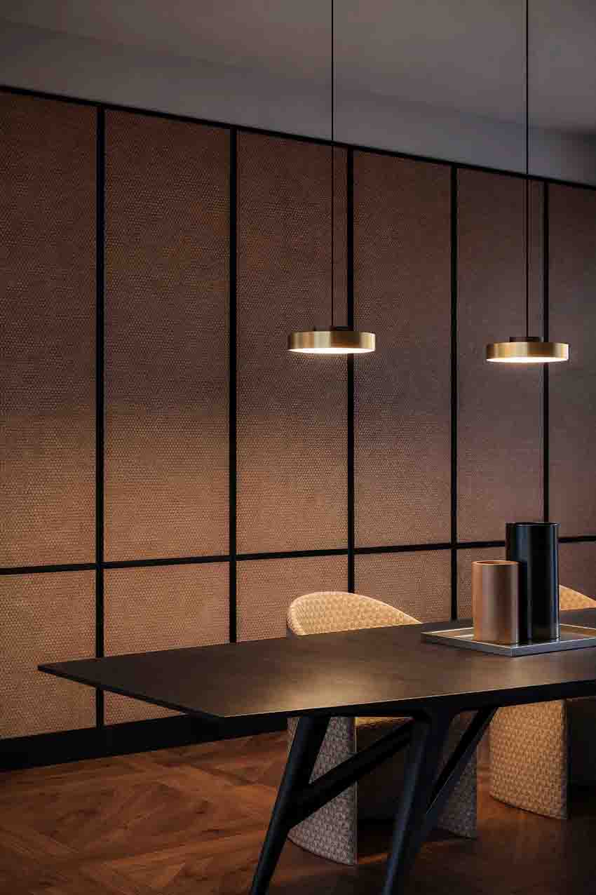 Two metal discs, which can be white or black, enclose the illuminating source in an interlocking game. The white opal diffuser in the middle is framed by a semi-polished brass band that gives a touch of luxury to the design. The particular shape of the structure, which in the wall version has a 120°rotating arm, allows the light to spread uniformly over the entire surface – this makes the product ideal for any location and use, in both residential and high-end hospitality contexts.