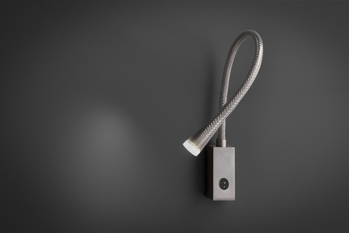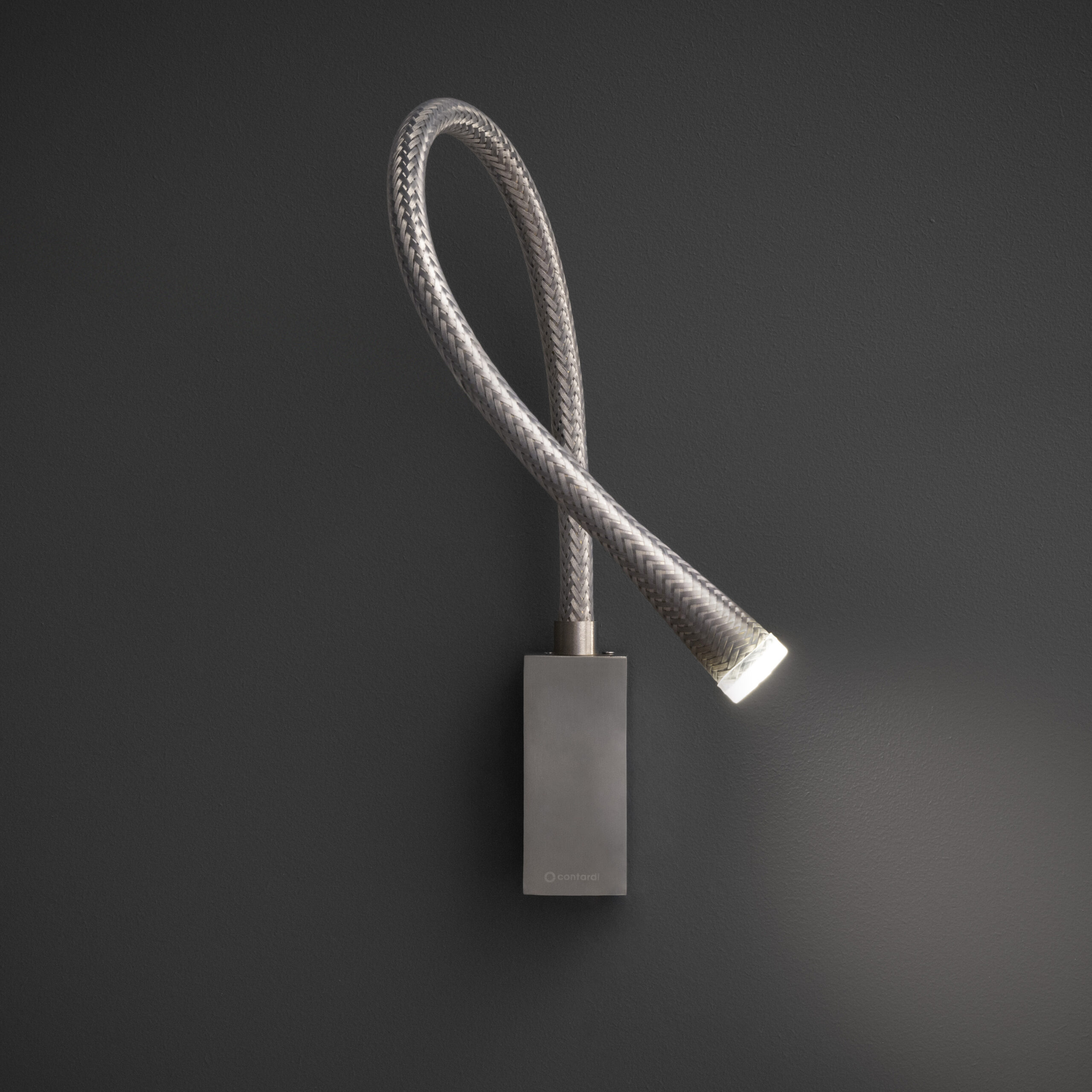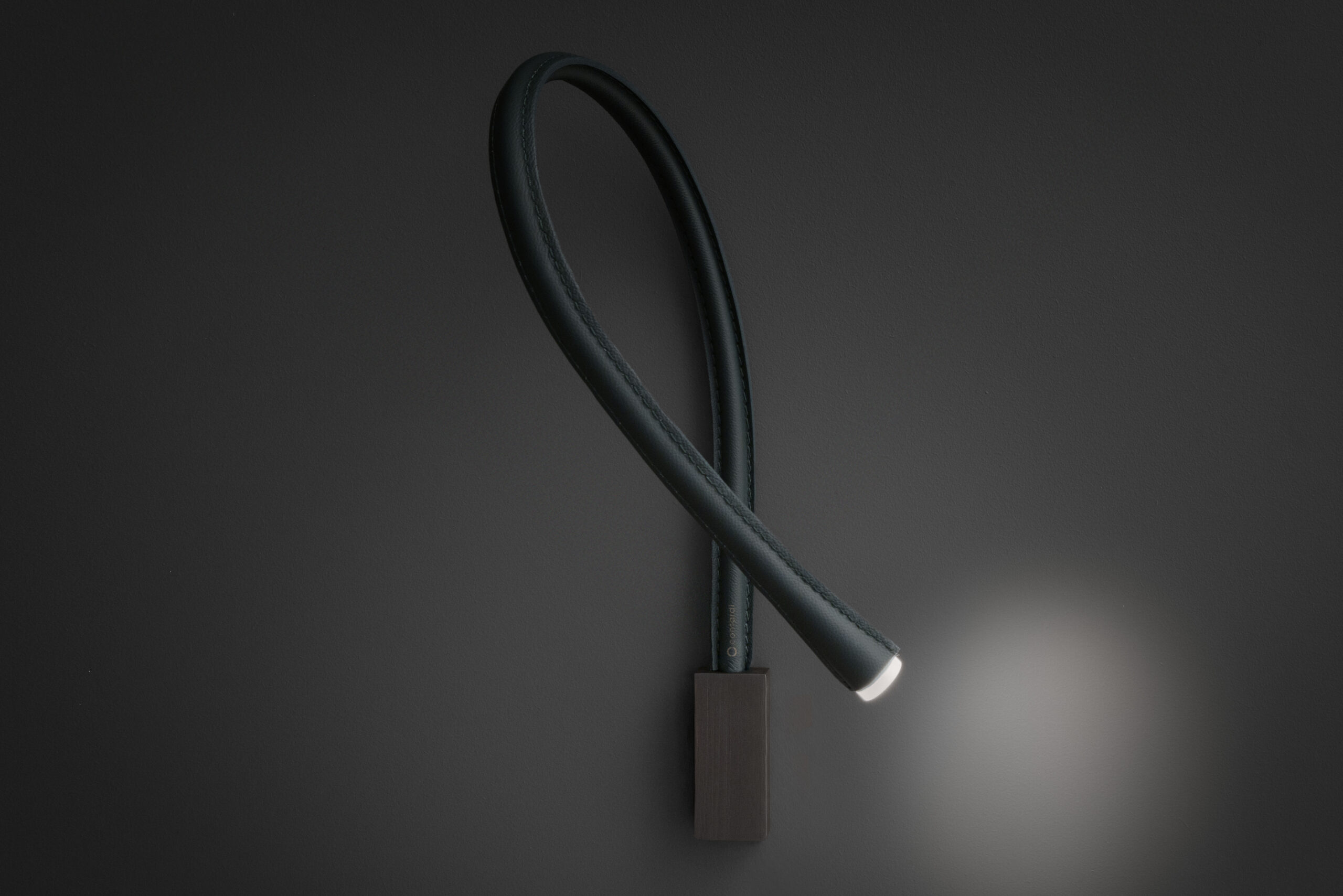 Flexiled, a historic and iconic product in Contardi's collection, is available in two variants: with a flexible arm covered in leather with double side stitching or encased in a steel mesh wrapped in a transparent sheath. It offers customization options in colors and sizes.