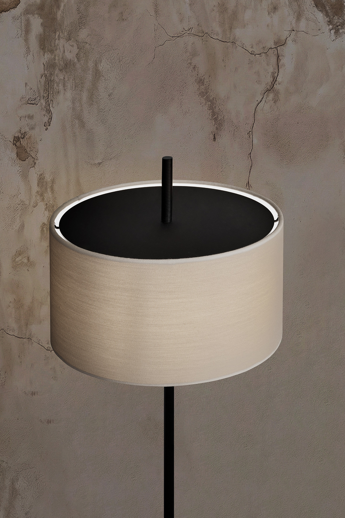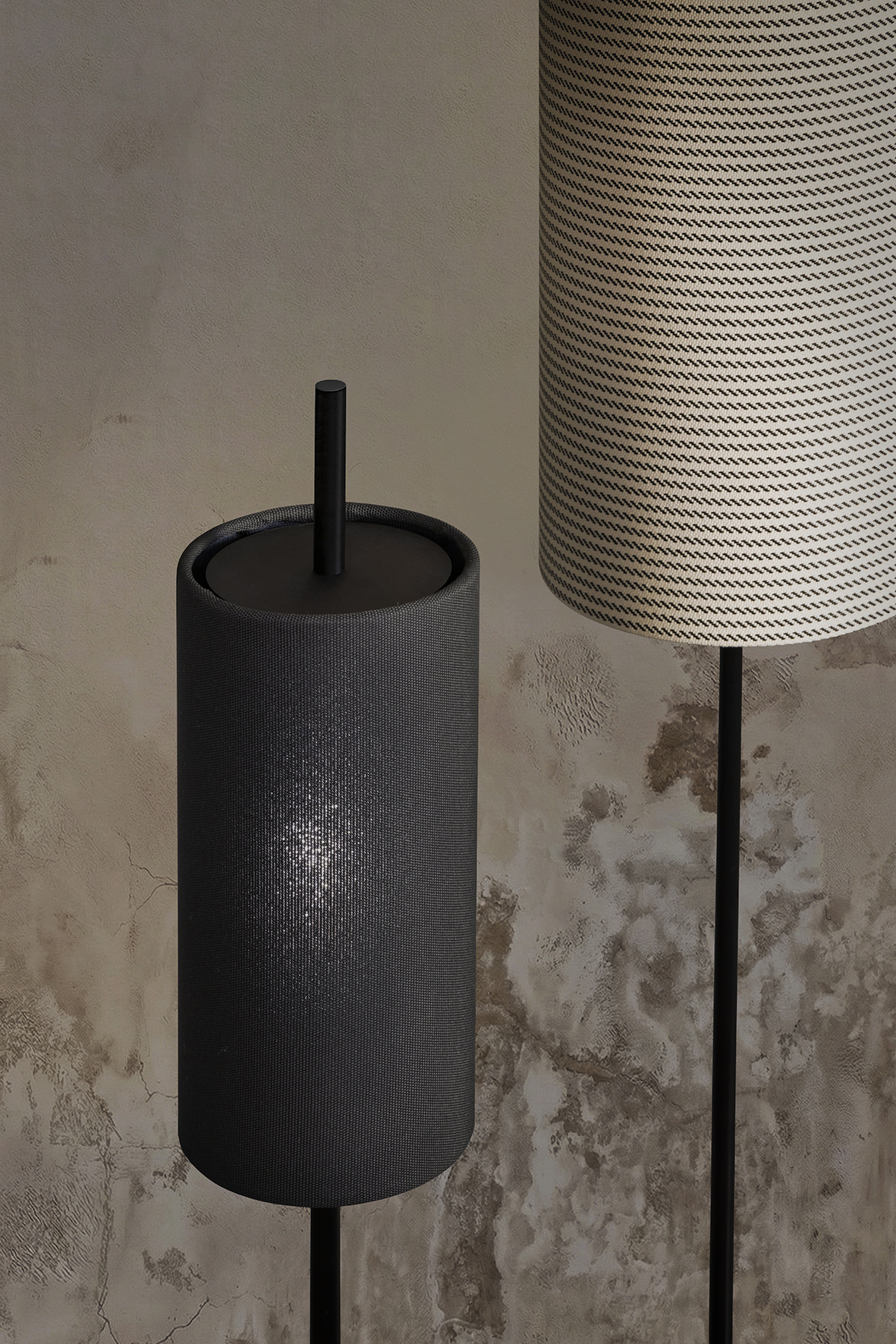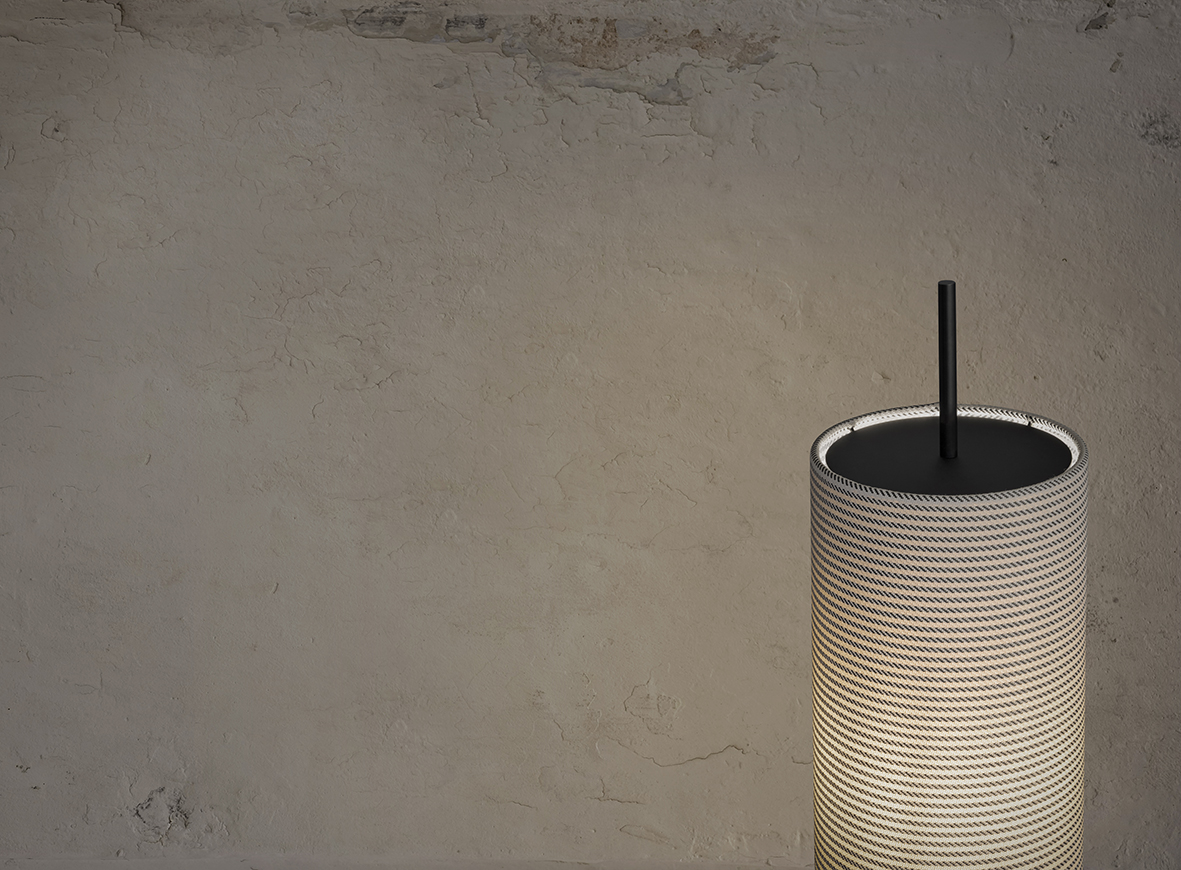 The collection is defined by lampshades with a linear, essential form, available in three different finishes, each paired with a specific height: the small version is available in black, the medium in beige, while the large features a white finish with black horizontal decorations. All lampshades are covered in Dedar fabric, selected for its aesthetic and performance qualities.