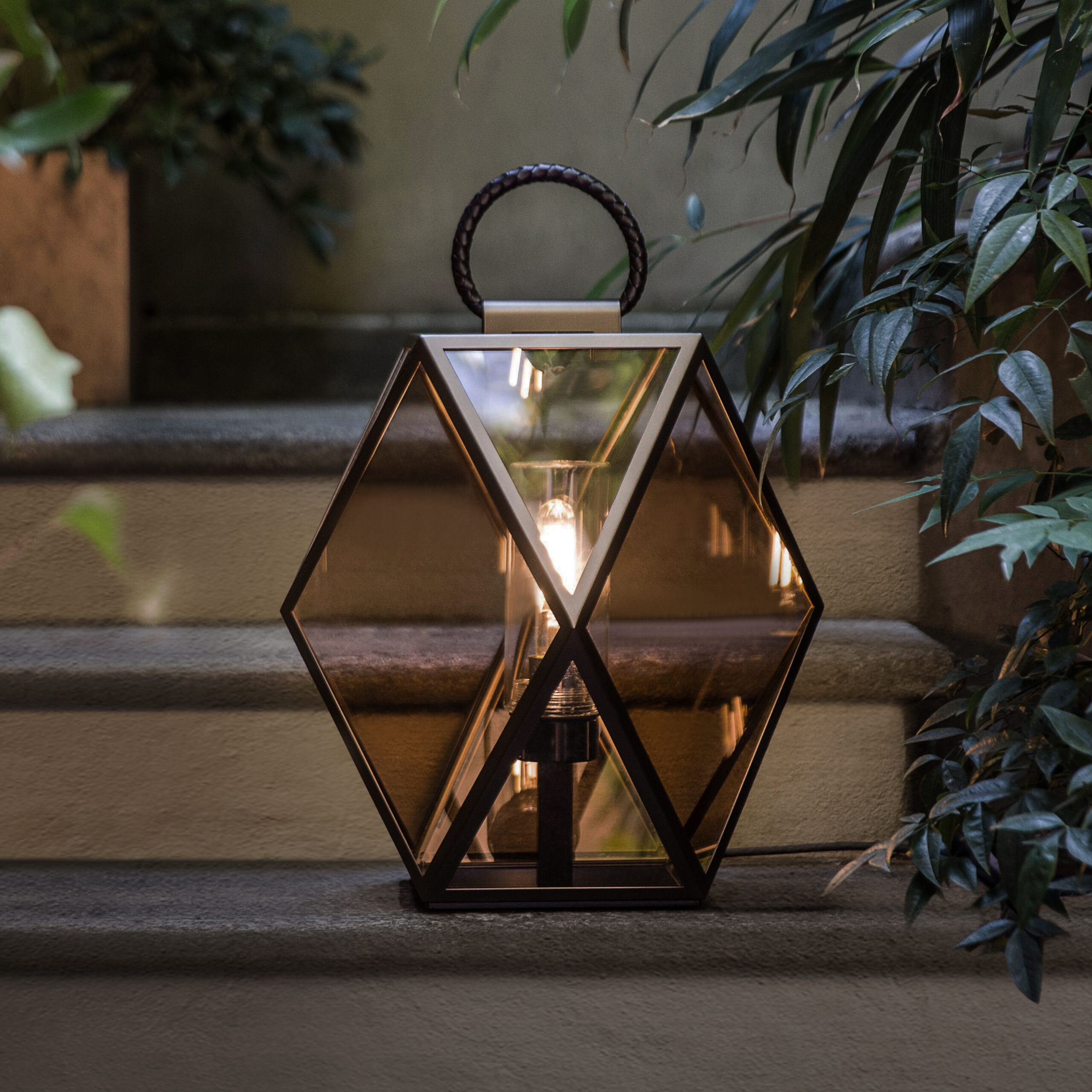 Muse Lantern Outdoor can be battery operated or wired. In the wired version, the light source is placed inside a glass cylinder which is suitably sealed to ensure IP65 protection. The new battery model maintains the characteristics of the lantern but with a more sophisticated touch: the light source has a new look that makes it much more contemporary and captivating. The simulation of the light bulb creates an alternation of lines, giving it a more modern appearance, while also guaranteeing better performance. Both versions are now available in small, medium and large sizes. The bronze finish of the Muse Lantern has been treated to withstand outdoor spaces and atmospheric conditions, with a handle in woven leather. The plastic diffuser in the Outdoor version remains in a transparent amber finish.