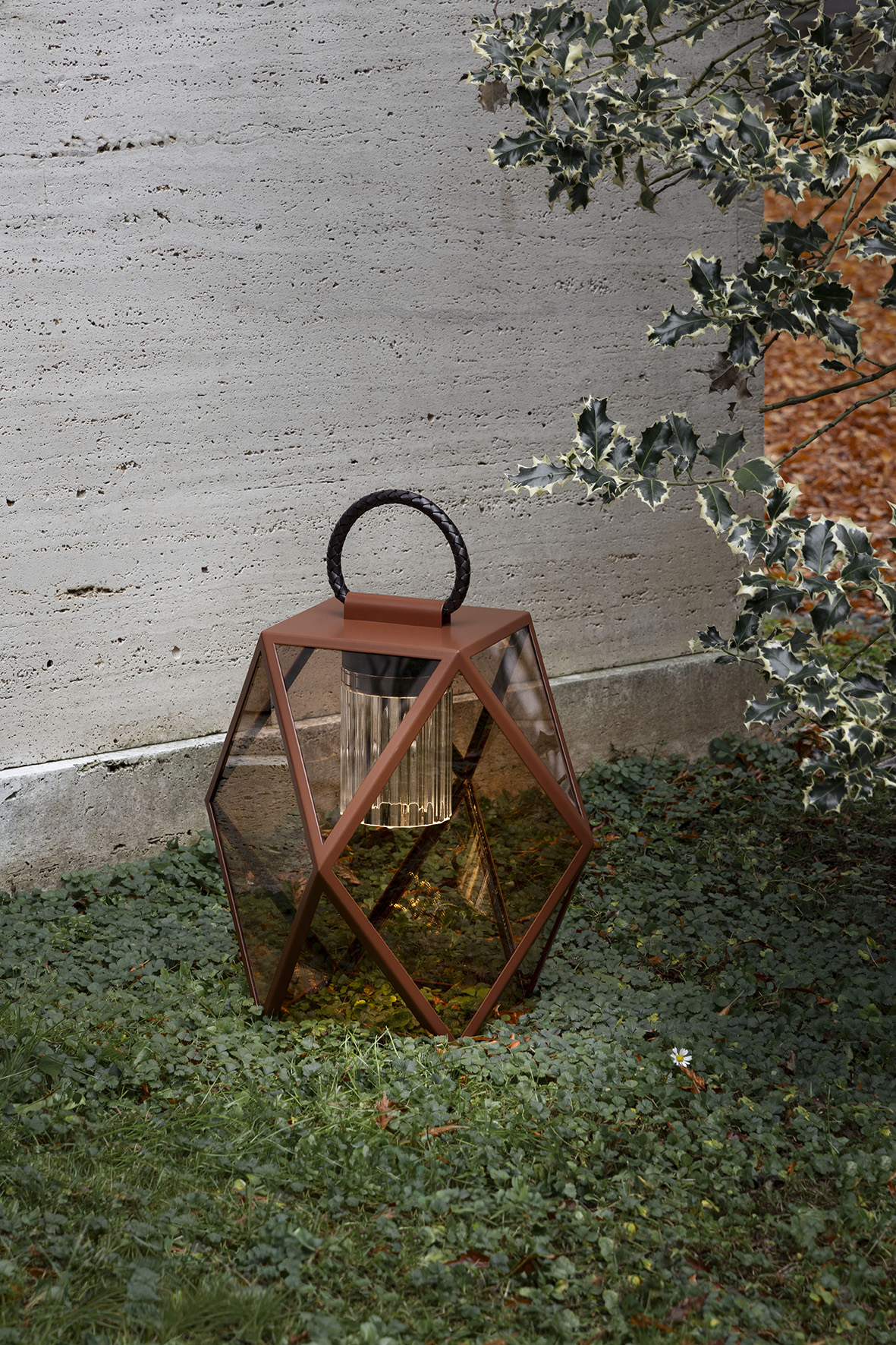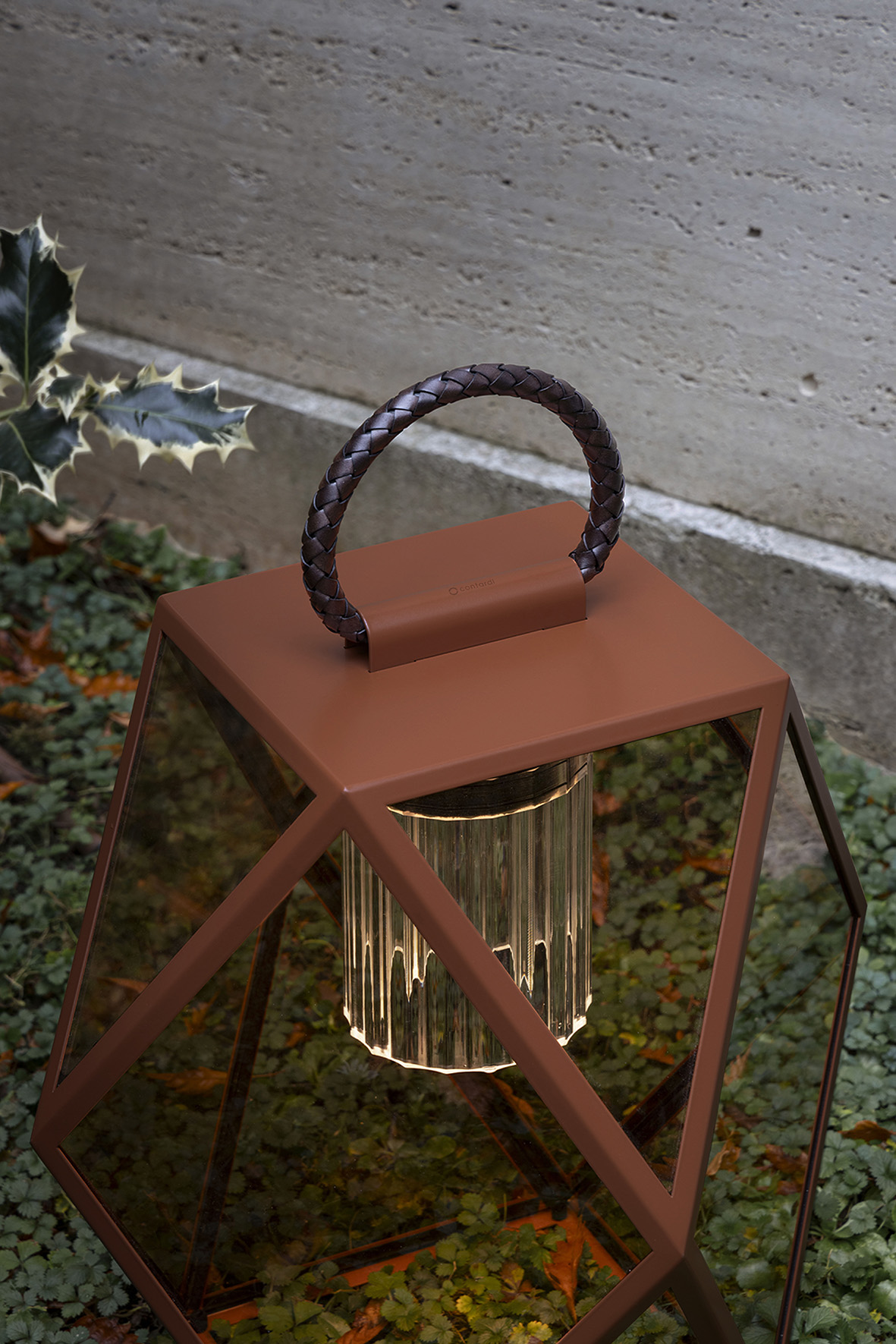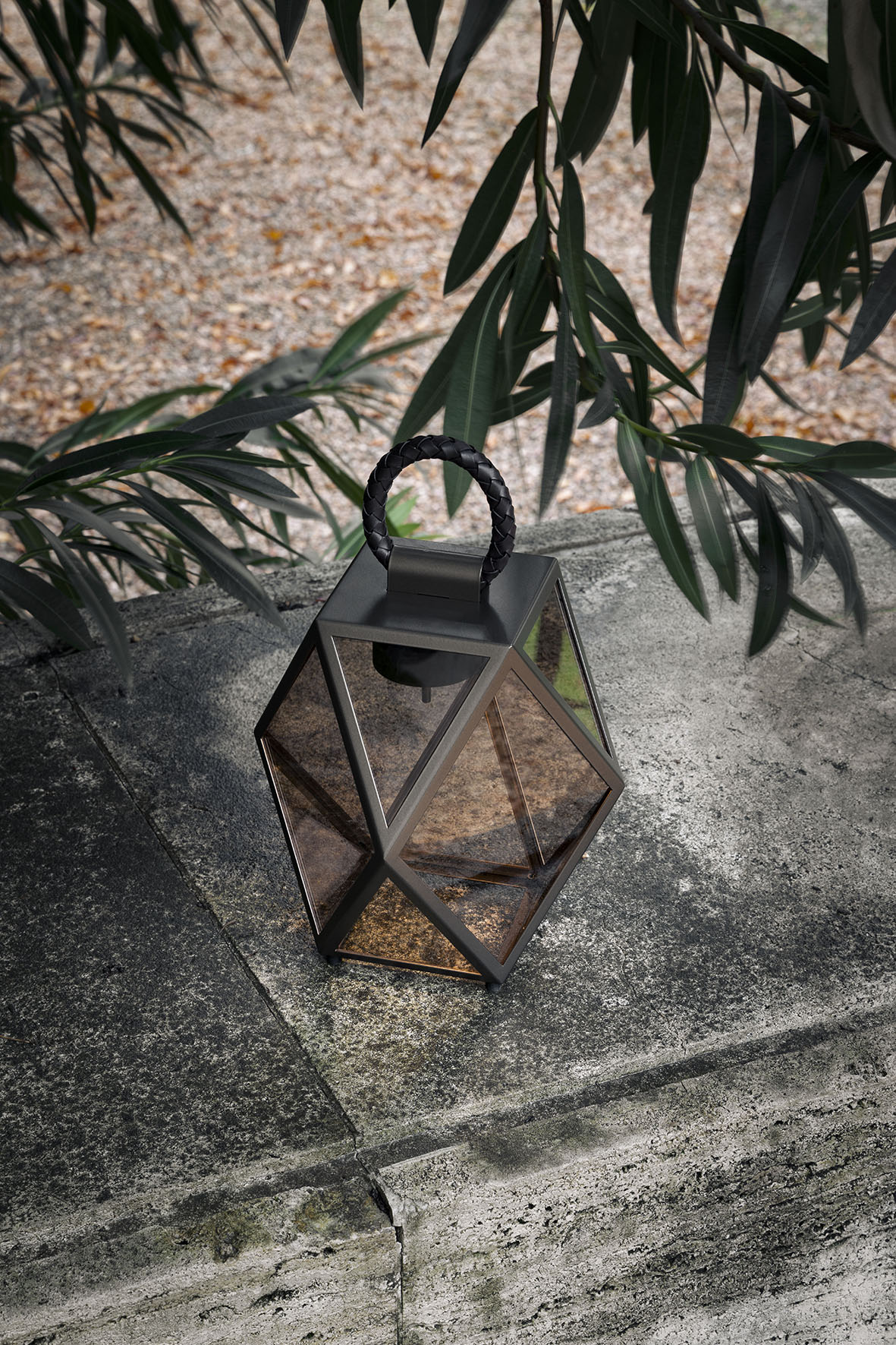 The metal structure of Muse—now available in four new finishes: black, bronze, terracotta, and a refined cream color—is enhanced by a leather handle that allows the lamp to be moved with ease, both outdoors and indoors: on the floor, on a table, by a pool, or to illuminate the deck of a boat.