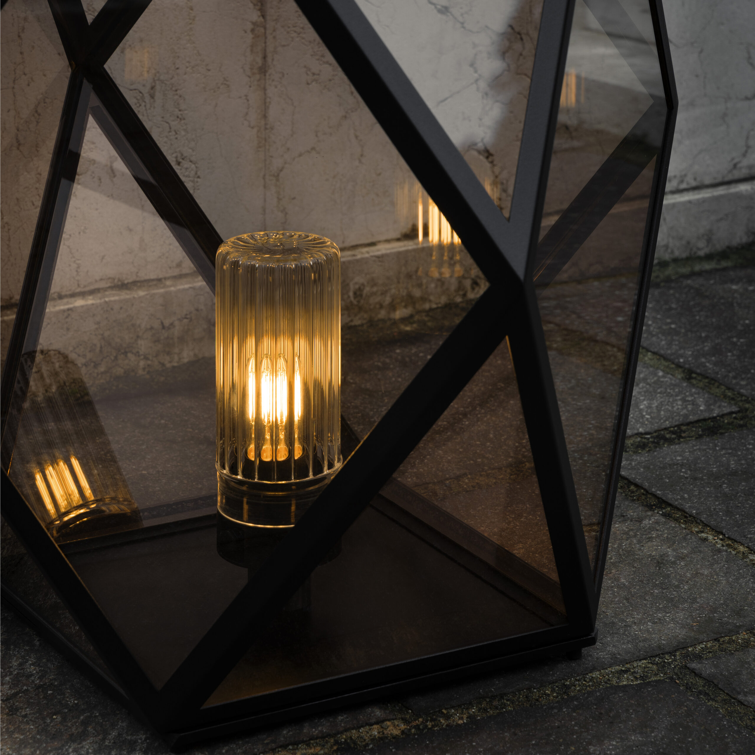 The new wired Muse lamp is available in two sizes, medium and large, with the light source positioned at the bottom inside a new ribbed glass diffuser. This creates a dynamic interplay of lines, giving the lamp a modern appearance while ensuring optimal performance.