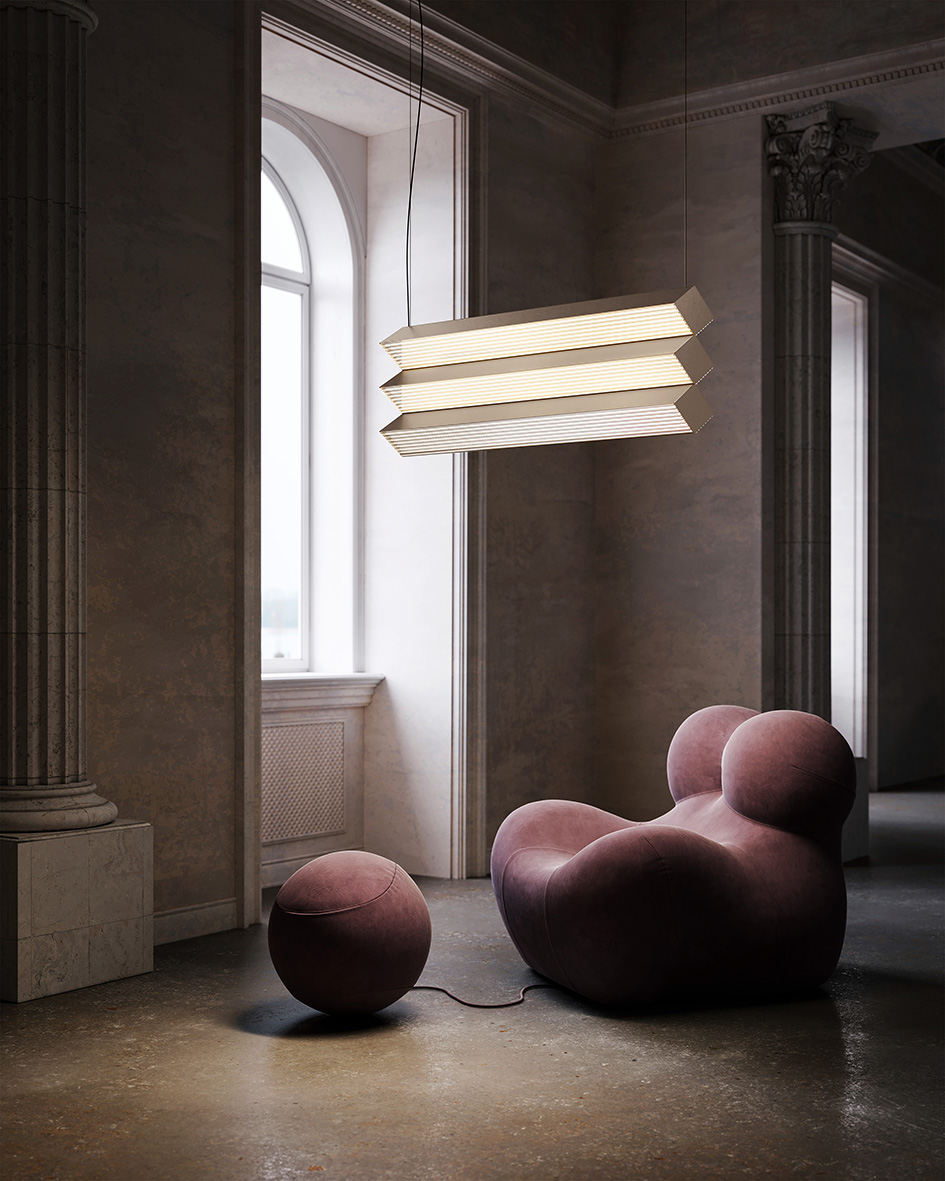 Triangular elements with pure, essential lines, which emanate an atmospheric light while being functional. Light takes the leading role, thanks to the ribbed diffuser, chosen specifically to produce unique plays of illumination in various contexts.