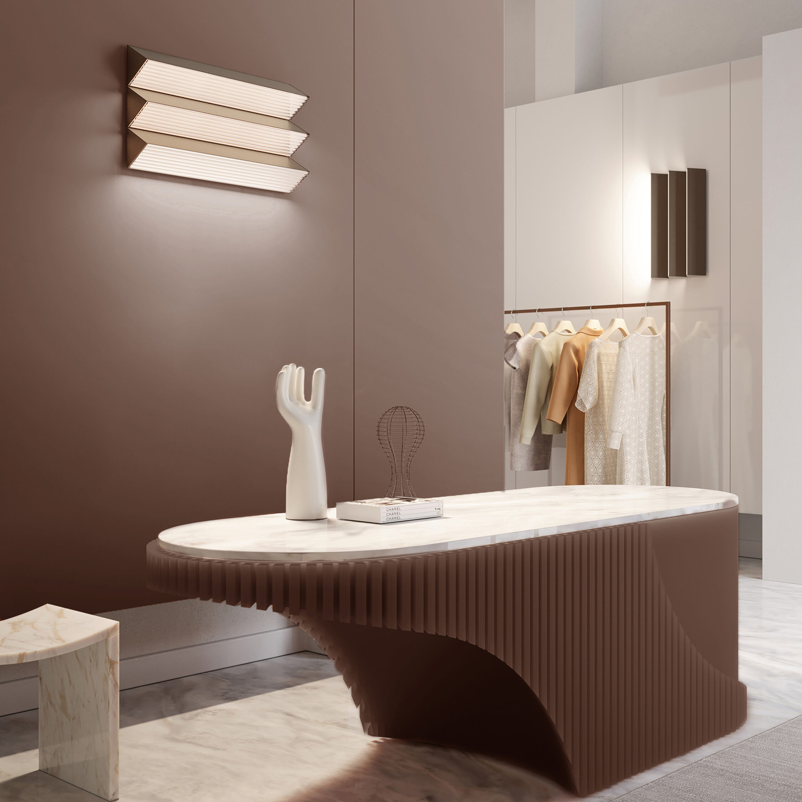 Already available in suspension and floor versions, the Stick wall version’s skilfully modulated light emanates from a diffuser with a ribbed glass effect, contained within a metal structure in champagne or brushed bronze-nickel finishes.